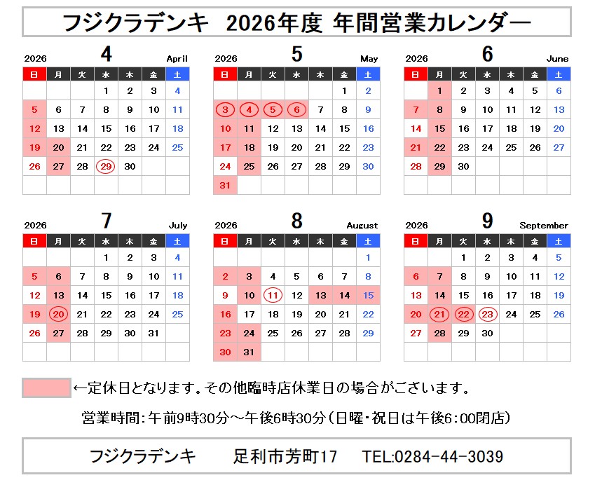 でございまして、この度フジクラデンキ(足利店)の定休日を変更させていただきます。
