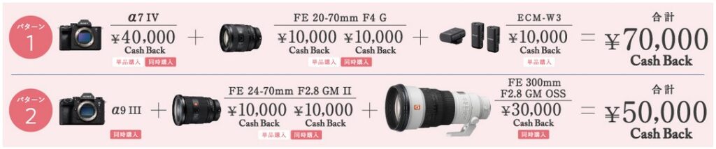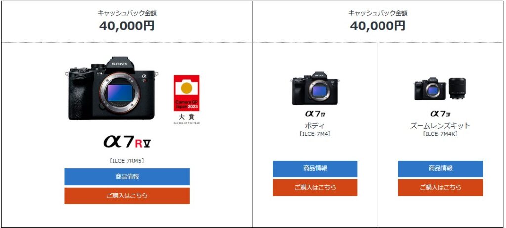 メインはコチラ、α7RⅤとα7Ⅳ(レンズキット含む)がボディ40,000円のキャッシュバックです。