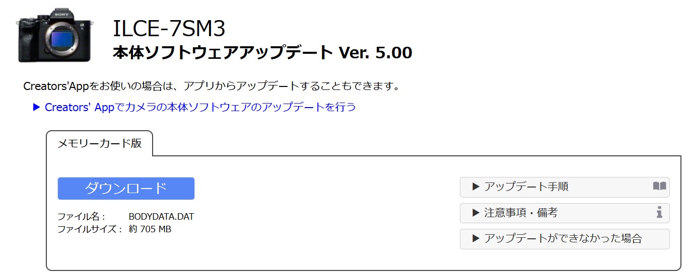 >ILCE-7SM3 本体ソフトウェアアップデート|本体アップデート情報